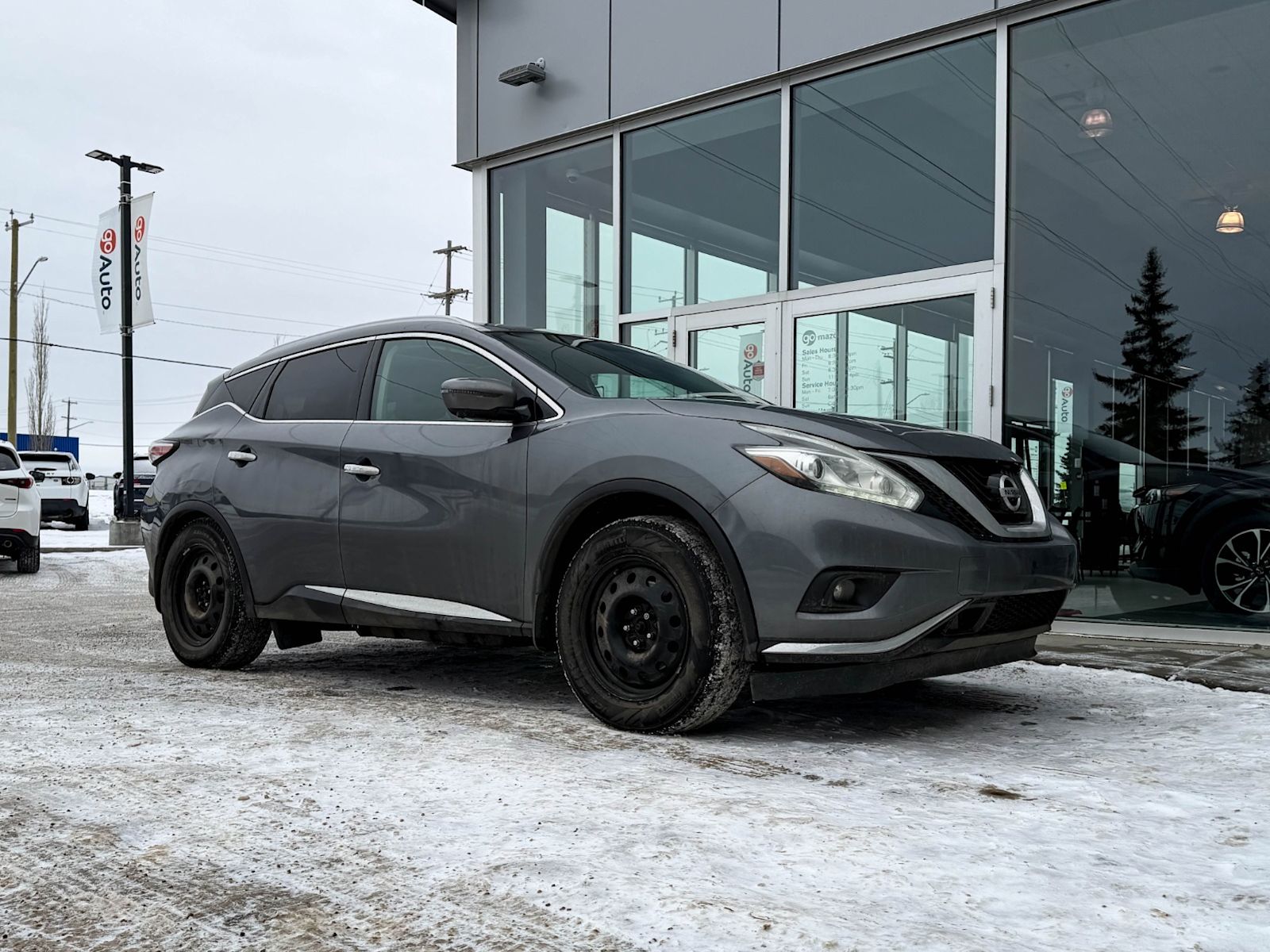 Plus Taxes & LicensingExperience luxury and versatility in this pre-owned 2017 Nissan Murano SL AWD, finished in sleek Grey. Powered by a smooth 3.5L V6 paired with an efficient Xtronic CVT, and featuring full-time all-wheel drive, it offers confident handling and a comfortable ride. Enjoy premium amenities like leather-appointed heated front seats with power adjustments, dual-zone automatic climate control, and an AM/FM/CD audio system with navigation on an 8-inch touchscreen. Safety is paramount with advanced features including adaptive cruise control, forward collision mitigation, blind spot warning, and a 360-degree camera system. With 20-inch machined aluminum wheels, ample cargo space, and a full tank of fuel, this Murano is ready for your next adventure. Visit Go Mazda today to test drive this well-equipped SUV!Go Mazda is an AMVIC licensed business.This vehicle is showing CarFax incidents in the amount of $9,772.83 and $4,458.00